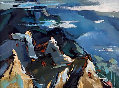 Bức tranh “Bình minh Tản Đà”, mang phong cách trừu tượng giàu cảm xúc và không khí thiêng liêng của thiên nhiên. Tác phẩm nổi bật với gam xanh lam, xanh xám làm nền chủ đạo, gợi nên không gian sớm mai còn bảng lảng sương mù. Những mảng màu đậm nhạt chồng lớp, đan xen giữa sắc xanh lạnh của trời và điểm nhấn ấm áp của vàng đất, cam nâu, tạo cảm giác ánh bình minh đang dần hé rạng trên triền núi. Các khối hình gãy, mạnh và dứt khoát như cấu trúc đá núi vững chãi, trong khi những nét cọ mềm và loang gợi mây trôi, sương tan. Toàn bộ bức tranh mang nhịp điệu chậm rãi, tĩnh tại, vừa hùng vĩ vừa trầm lắng, như một khoảnh khắc giao hòa giữa đất trời và thời gian, nơi vẻ đẹp của núi Tản Viên được cảm nhận bằng cảm xúc hơn là hình tướng cụ thể.