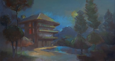 Tác phẩm “Bình yên” khắc họa một khung cảnh thanh thản tại khu nghỉ dưỡng Hà Vy Garden, Ba Vì, Hà Nội. Ngôi nhà nghỉ dưỡng hiện đại với mái ngói và ban công rộng mở nằm giữa thiên nhiên xanh mát, được bao quanh bởi những hàng cây cao và bụi rậm, tạo nên không gian tĩnh lặng, thư giãn. Phía trước là hồ bơi trong vắt, phản chiếu bầu trời xanh thẳm, góp phần làm nổi bật vẻ đẹp tự nhiên và sự hài hòa của cảnh vật. Ánh sáng trong tranh được thể hiện nhẹ nhàng, ấm áp, mang lại cảm giác dễ chịu và gần gũi. Xa xa là dãy núi mờ ảo, như ôm trọn không gian nghỉ dưỡng trong vòng tay thiên nhiên. Tác phẩm không chỉ là một bức tranh phong cảnh mà còn là lời mời gọi người xem tìm về sự an yên, tĩnh tại giữa nhịp sống hiện đại.