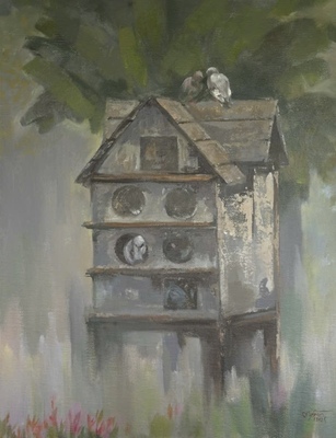 Bức tranh gợi lại khung cảnh bình yên của một tổ chim tại Hà Vy Garden, nơi thiên nhiên và con người giao hòa trong sự tĩnh lặng. Ngôi nhà chim bằng gỗ cũ kỹ, phủ màu thời gian, trở thành trung tâm của bố cục, vừa giản dị vừa ấm áp. Những chú chim nép mình trong các ô cửa tròn, một đôi chim âu yếm trên mái, gợi cảm giác gia đình, tình thân và sự sum vầy. Nền cây lá xanh mờ ảo hòa quyện cùng sắc hoa đỏ nhạt phía dưới, tạo nên không gian mơ hồ như một bức ký ức. Tác phẩm mang tinh thần hoài niệm, chất chứa sự thanh thản và tình yêu thiên nhiên.