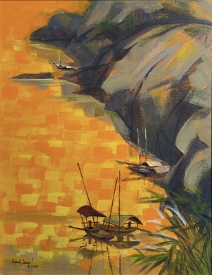 Tác phẩm “Chiều vàng” là một bức tranh phong cảnh đầy chất thơ, tái hiện khoảnh khắc hoàng hôn trên mặt nước. Màu vàng rực rỡ bao phủ toàn bộ không gian, tạo cảm giác ấm áp, tĩnh lặng và lãng mạn. Những chiếc thuyền nhỏ neo đậu gần bờ đá, phản chiếu ánh sáng cuối ngày, mang lại chiều sâu và sự sống động cho tranh. Bờ đá với gam màu xám và xanh lá tạo nên sự tương phản nhẹ nhàng, làm nổi bật sắc vàng chủ đạo. Tác phẩm gợi cảm giác thư thái, như một lời mời gọi người xem dừng lại, lắng nghe thiên nhiên.