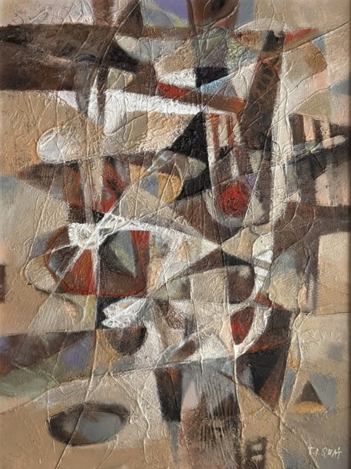 Bức tranh mang phong cách trừu tượng hiện đại với bố cục chồng chéo của các mảng hình học và đường nét đan xen. Gam màu chủ đạo là nâu đất, be, xám xen lẫn những điểm nhấn đỏ và trắng, tạo nên sự tương phản thị giác mạnh mẽ. Các lớp màu được chồng phủ và xử lý bề mặt có độ nhăn, gợi cảm giác chất liệu phong phú, gần như một bức phù điêu. Đường nét xiên chéo và vòng xoáy trắng dẫn dắt ánh nhìn, tạo sự chuyển động liên tục, như một dòng chảy năng lượng ẩn bên trong. Tác phẩm gợi mở cảm xúc đa chiều, để người xem tự tìm ra hình ảnh và câu chuyện riêng.