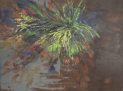 Tác phẩm “Hương cau xóm Muỗi” mang đậm chất trừu tượng, thể hiện hình ảnh bụi cau qua lăng kính cảm xúc và ký ức. Với gam màu chủ đạo là nâu, xanh lá và vàng, tranh gợi lên không khí ấm áp, gần gũi của làng quê Bắc Bộ. Những nét cọ dứt khoát, mạnh mẽ tạo nên hình ảnh lá cau sống động, như đang lay động trong gió, tỏa hương thơm mộc mạc. Bố cục tập trung vào phần trung tâm, nơi hình ảnh cau hiện lên rõ nét, trong khi phần nền được xử lý trừu tượng, tạo chiều sâu và không gian mở cho người xem tự do liên tưởng.