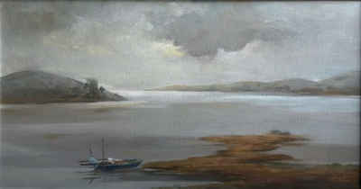 Tác phẩm “Tản Viên Sơn” là một bức tranh phong cảnh đầy chất thơ, tái hiện vẻ đẹp tĩnh lặng và sâu lắng của thiên nhiên vùng núi. Khung cảnh hồ nước rộng lớn trải dài, phản chiếu ánh sáng nhẹ nhàng từ bầu trời u ám, tạo nên sự tương phản tinh tế giữa sáng và tối. Những ngọn núi mờ ảo phía xa gợi cảm giác bao la, huyền bí, như một miền ký ức xa xăm. Chiếc thuyền nhỏ neo đậu gần bờ cùng những bụi cây ven hồ mang đến nét sinh hoạt đời thường, giản dị mà gần gũi. Bức tranh không chỉ là sự miêu tả cảnh vật mà còn truyền tải cảm xúc thư thái, thanh bình, như một lời mời gọi con người trở về với thiên nhiên, sống chậm lại và cảm nhận sự hòa hợp giữa đất trời và lòng người.